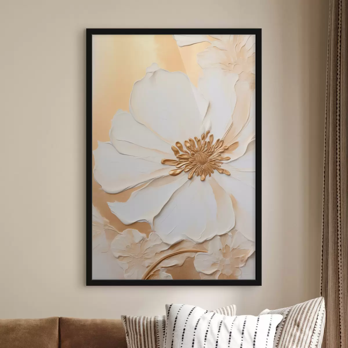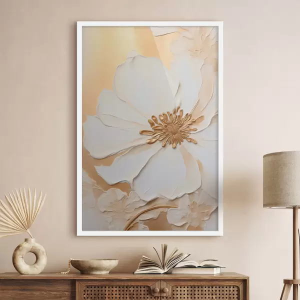 Poster Witte bloem met delicate bloemblaadjes met dikke penseelstreken imitatie, op een lichtoranje gestructureerde achtergrond N° f46691