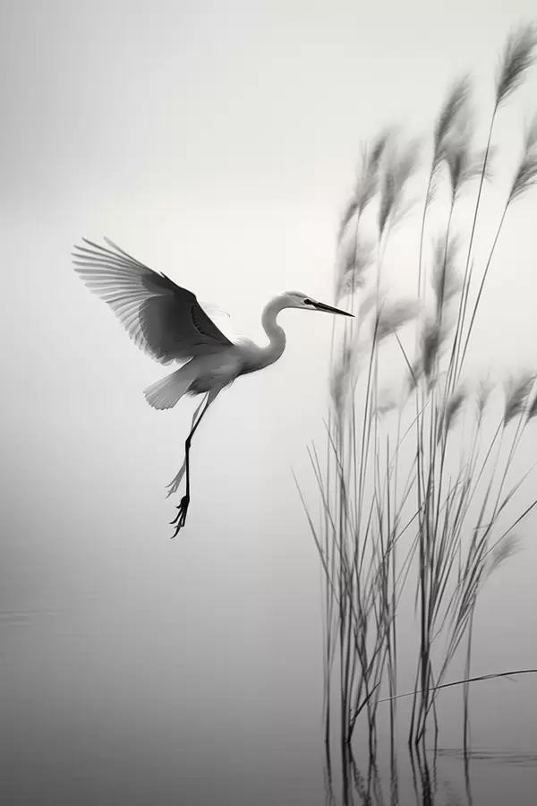 Poster Een witte reiger met gespreide vleugels, vliegend in de buurt van hoog riet, zwart-witte minimalistische compositie N° f46693