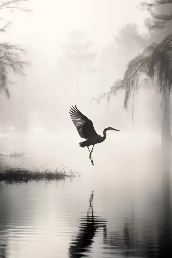 Poster Een witte reiger met gespreide vleugels, vliegend in de buurt van hoog riet, zwart-witte minimalistische compositie N° f46694