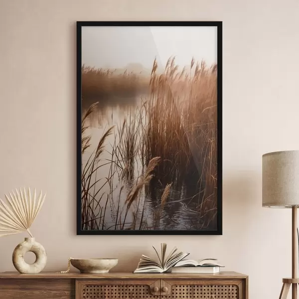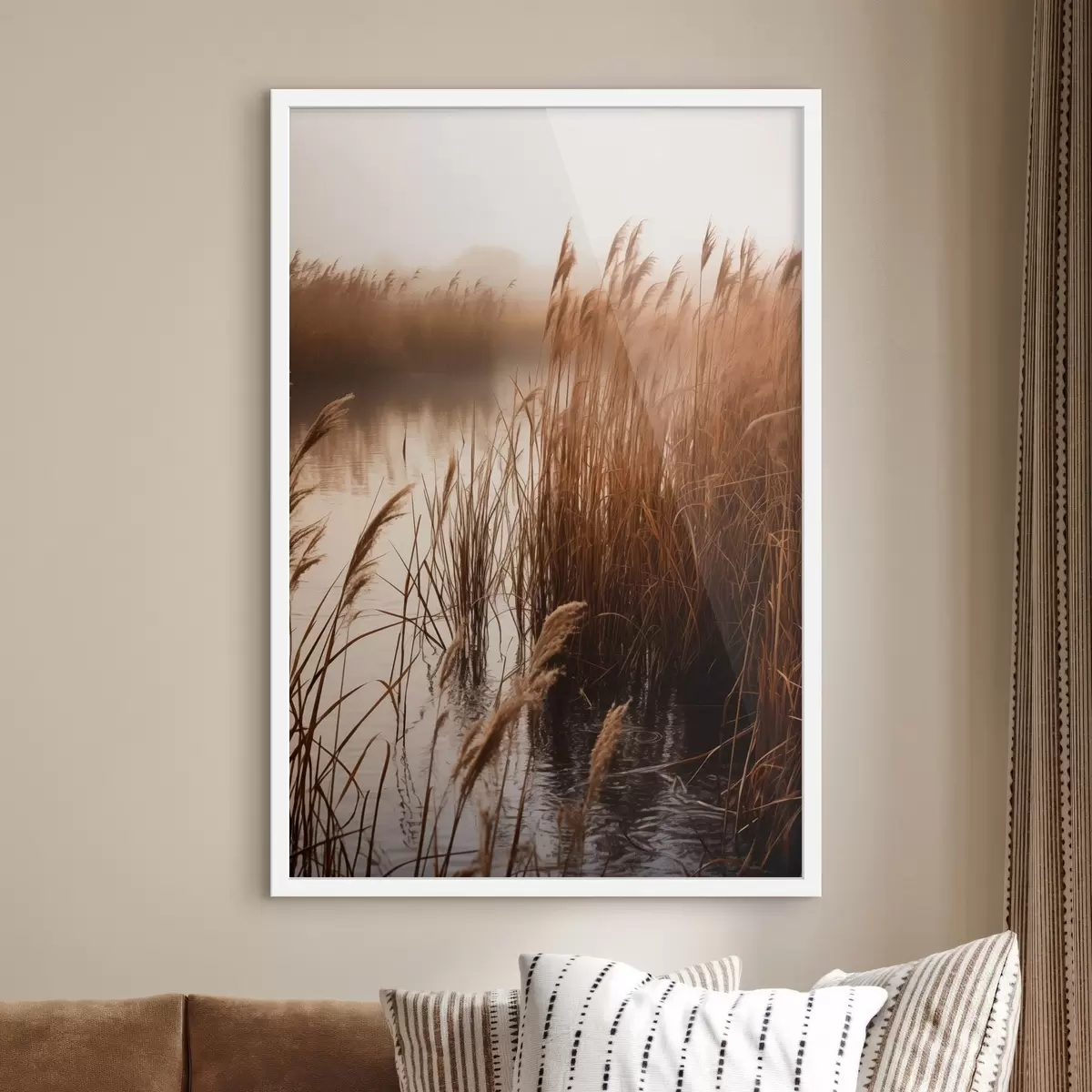 Poster Hoge rietstengels groeien in een watermassa, het water weerspiegelt het riet, mistige achtergrond, zacht licht, natuurtafereel f46695