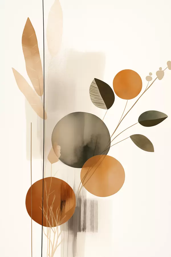 Poster Abstracte schilderijimitatie met oranje en grijze cirkels, bladeren en takken, moderne stijl, aquareleffect N° f46697