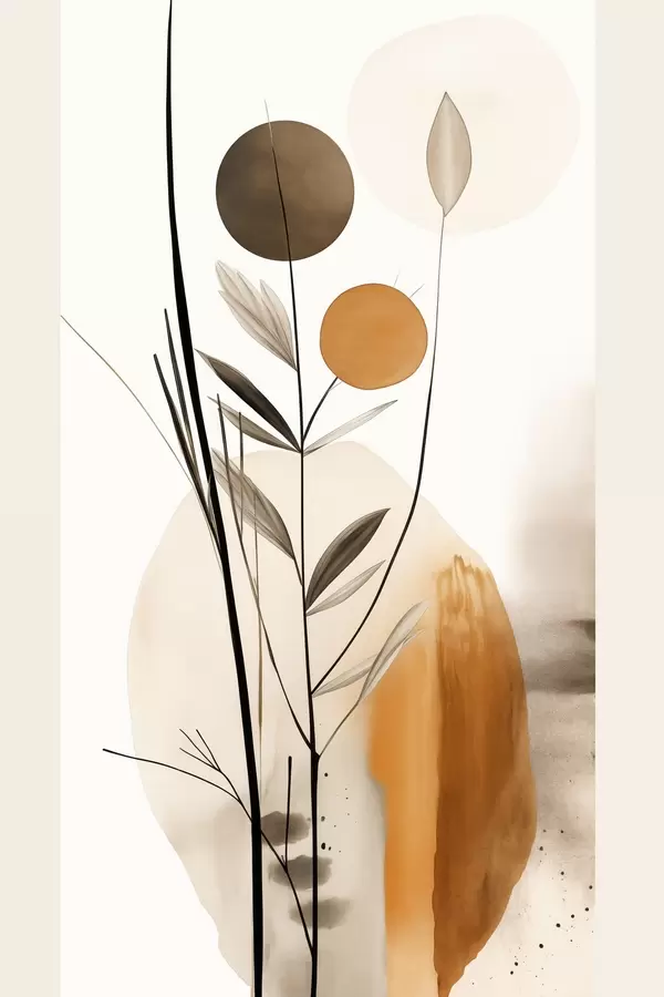 Poster Abstracte schilderijimitatie met oranje en grijze cirkels, bladeren en takken, moderne stijl, aquareleffect N° f46698
