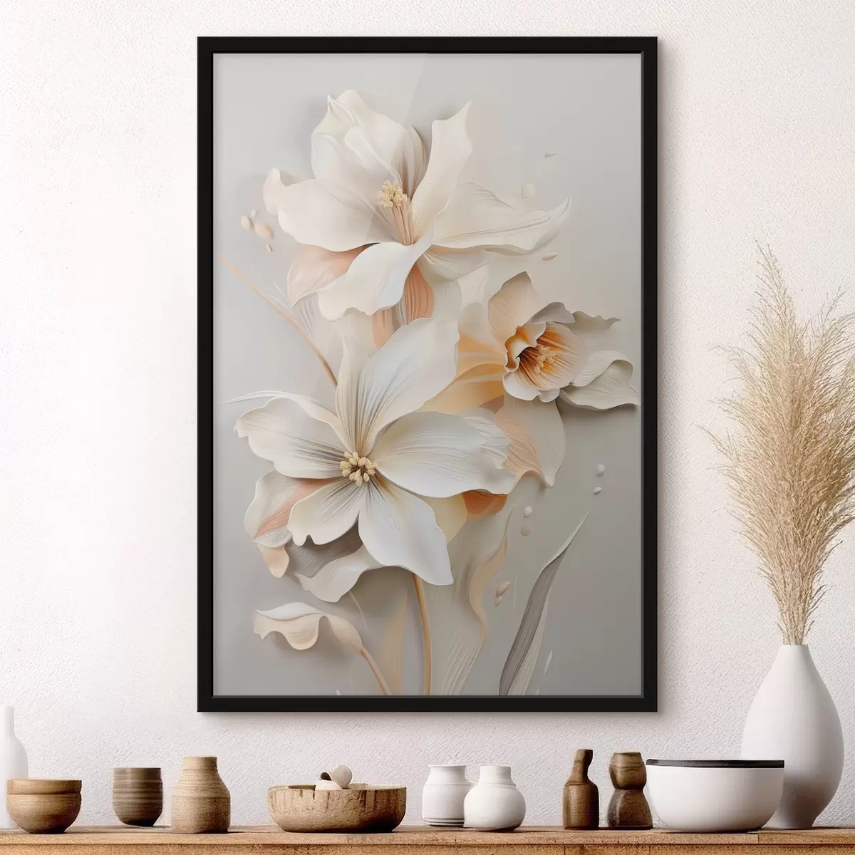 Poster Witte bloemen, bloemblaadjes met zachte schaduwen, lichtbeige achtergrond, elegante compositie, minimalistische stijl N° f46699