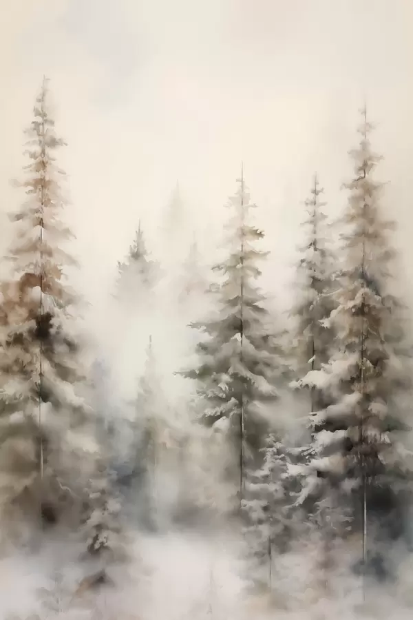 Poster Hoge dennenbomen bedekt met sneeuw, staande in een mistig bos, een zacht, gedempt winters tafereel N° f46701
