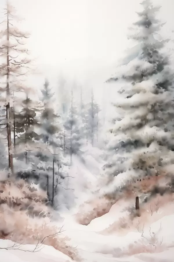 Poster Hoge dennenbomen bedekt met sneeuw, staande in een mistig bos, een zacht, gedempt winters tafereel N° f46702