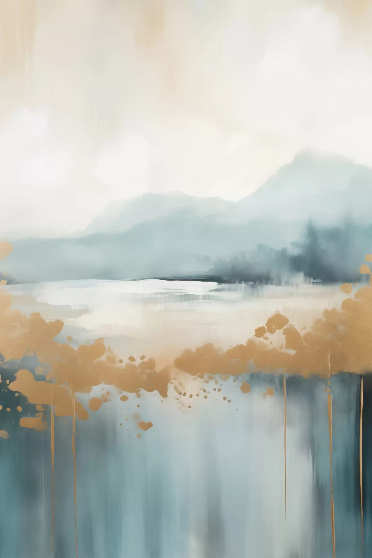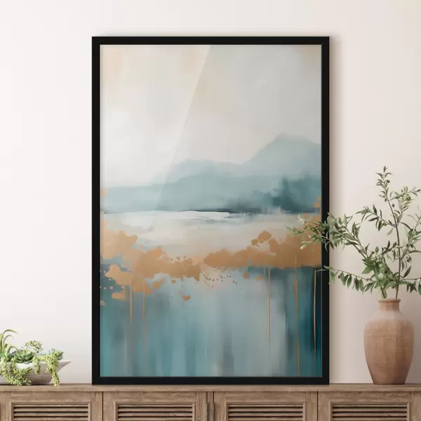 Poster Abstract landschap met bergen en meer in blauwgroen en gestructureerd geel, zachte penseelstreken, minimalistisch kunstwerk N° f46703