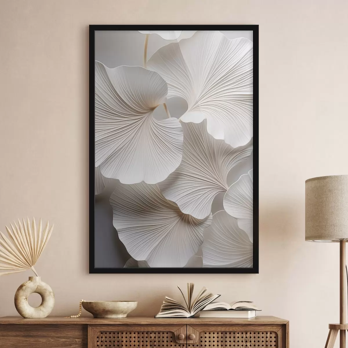 Poster Witte ginkgo biloba-bladeren met gedetailleerde nerven, zachte verlichting, elegant en minimalistisch ontwerp met textuur f46705