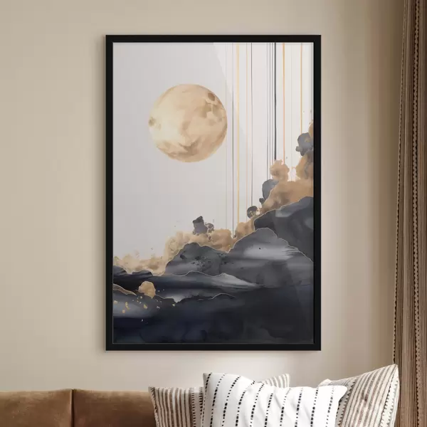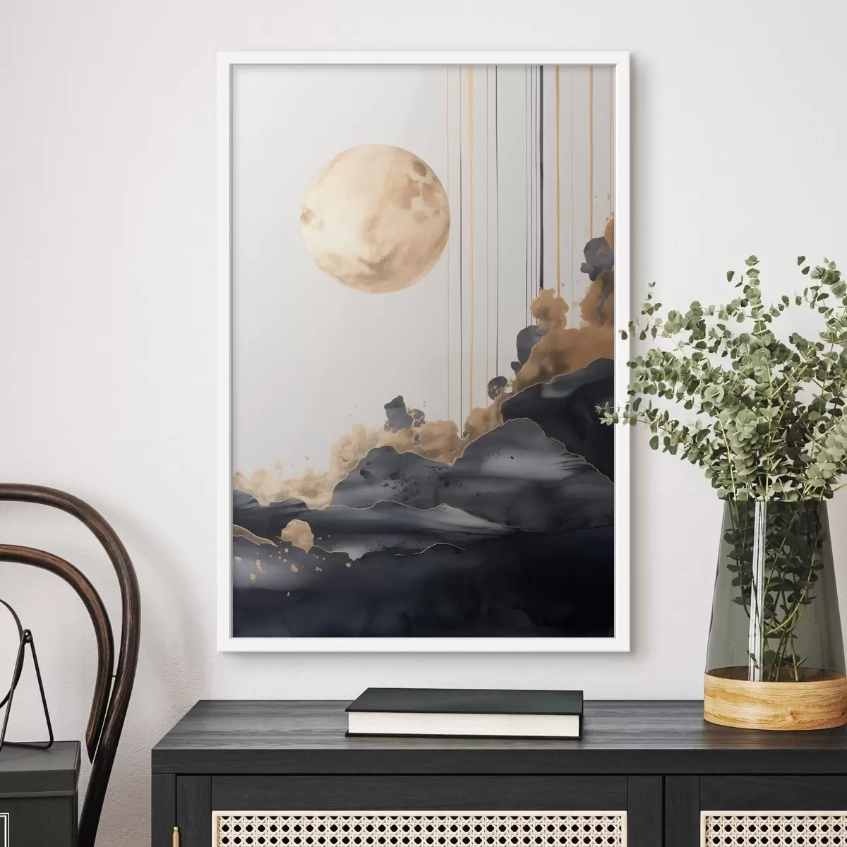 Poster Een volle maan met zwarte en gestructureerde gele wolken, verticale lijnen, abstracte stijl, minimalistisch en modern N° f46707