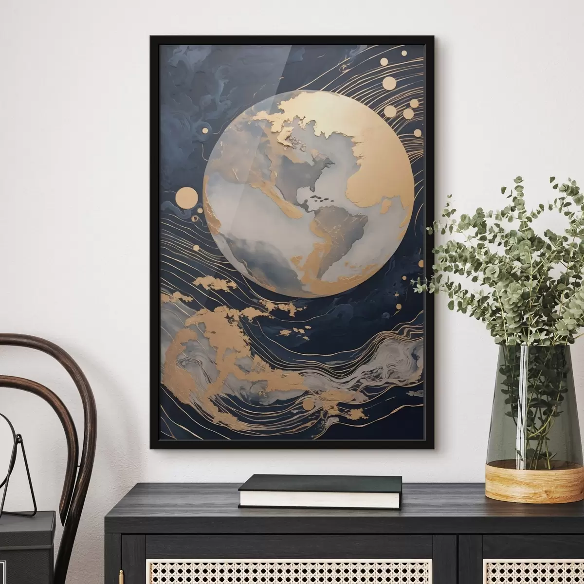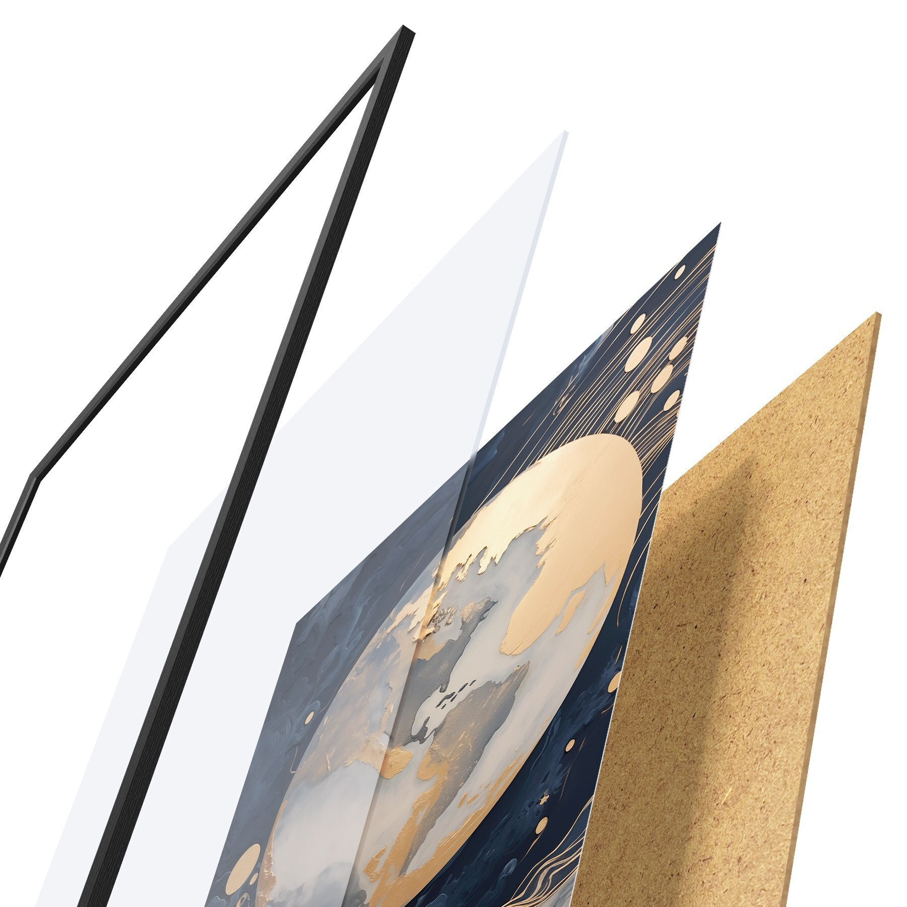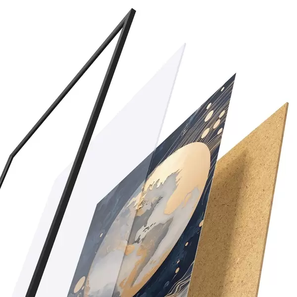 De poster bestaat uit een frame, plexiglas, geprinte afbeelding en spaanplaat achterkant. De poster kan meteen aan de muur worden gehangen dankzij de bevestigingen op de achterkant.