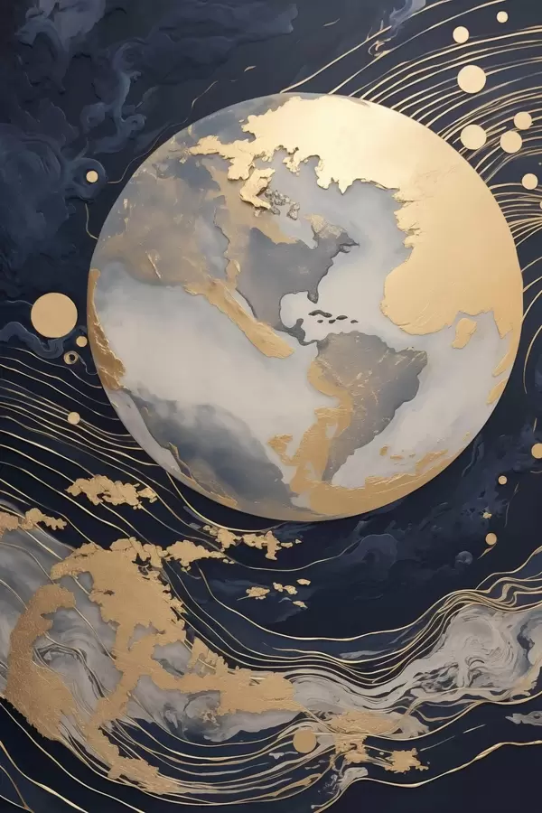 Poster Getextureerde decoratieve planeet met gele lijnen op de achtergrond, gele stippen op de achtergrond, donkere achtergrond N° f46708