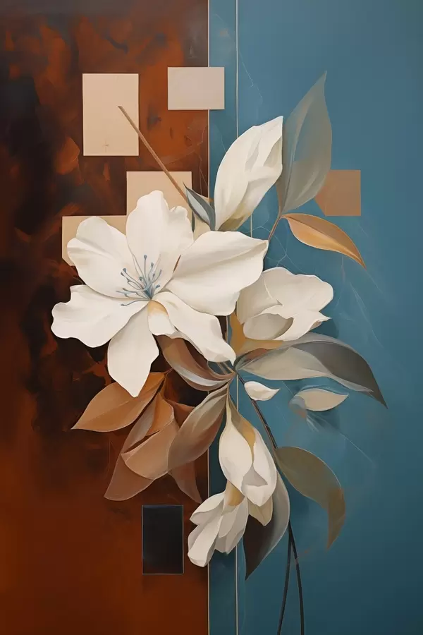 Poster Abstracte witte bloemen en bladeren tegen een achtergrond van bruin en blauw met abstracte vormen, in een minimalistische stijl N° f46709