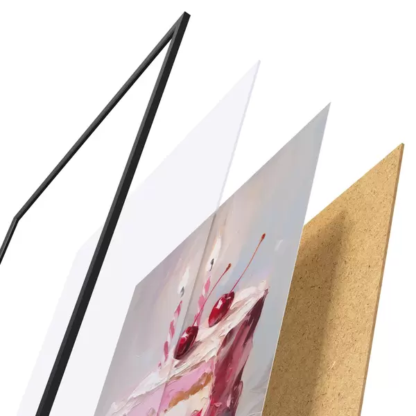 De poster bestaat uit een frame, plexiglas, geprinte afbeelding en spaanplaat achterkant. De poster kan meteen aan de muur worden gehangen dankzij de bevestigingen op de achterkant.