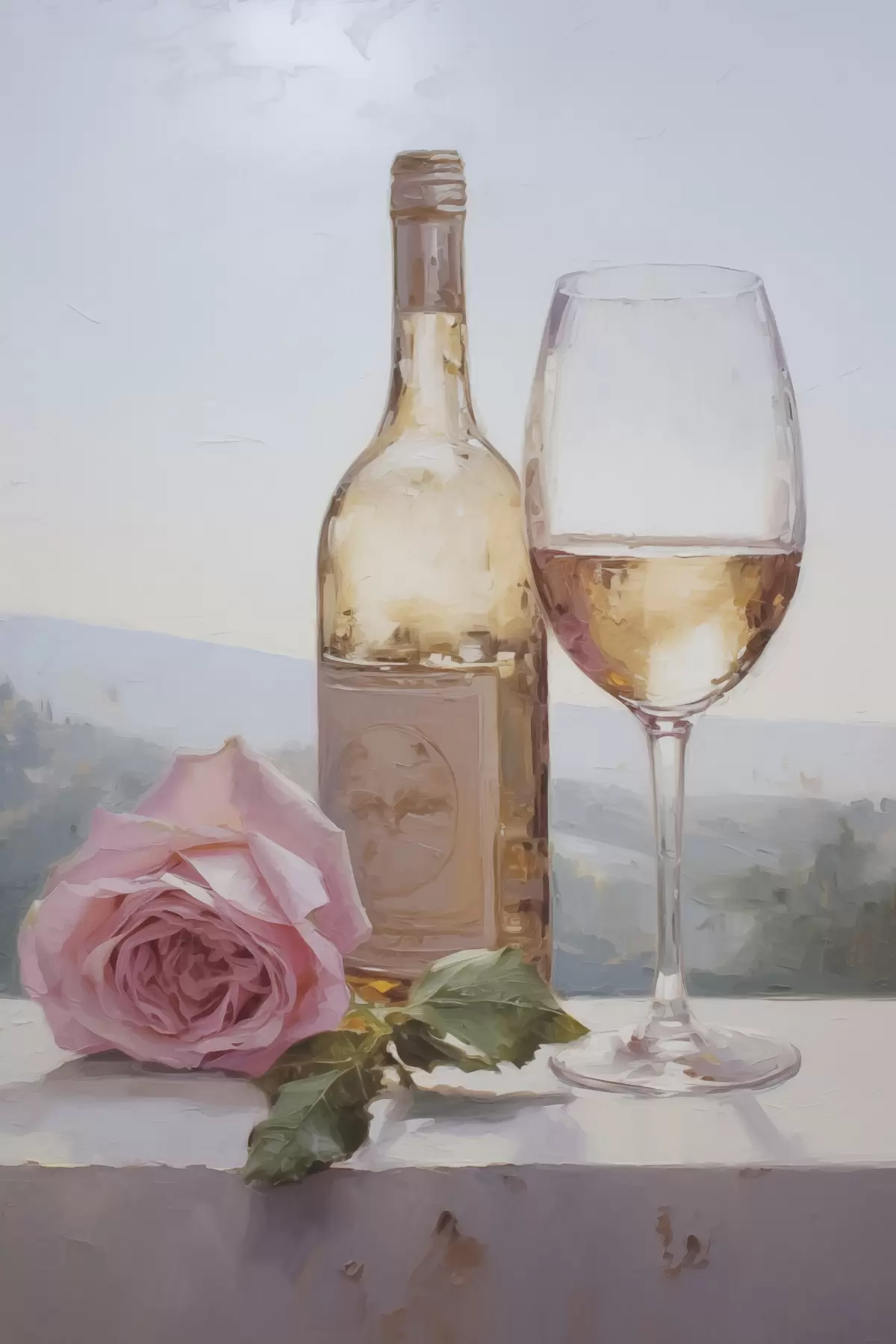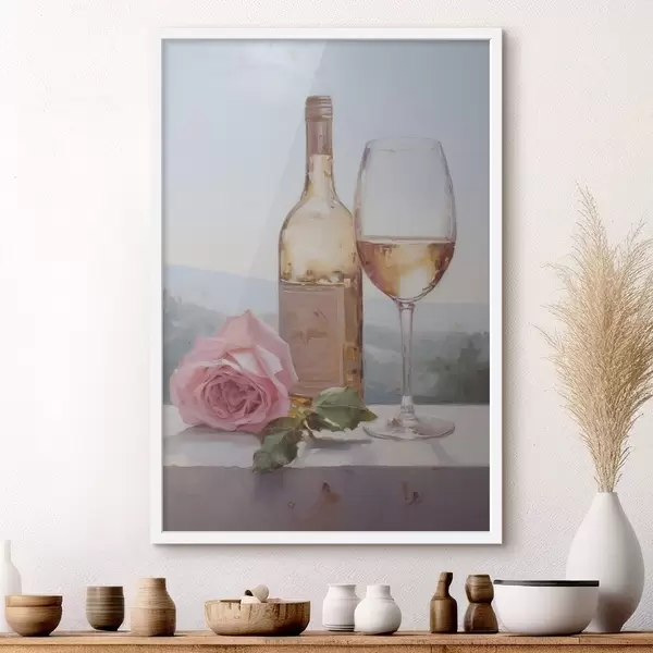 Poster Een fles en een glas wijn en een kleine hond met een bril, imitatie schilderij N° f46721