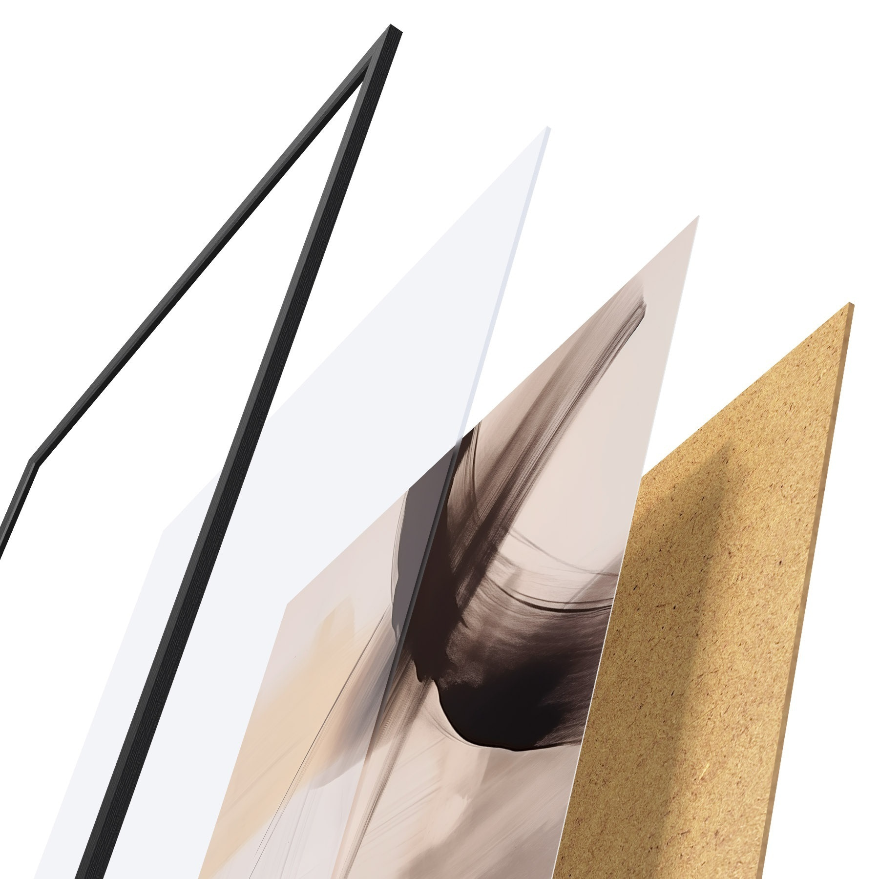 De poster bestaat uit een frame, plexiglas, geprinte afbeelding en spaanplaat achterkant. De poster kan meteen aan de muur worden gehangen dankzij de bevestigingen op de achterkant.
