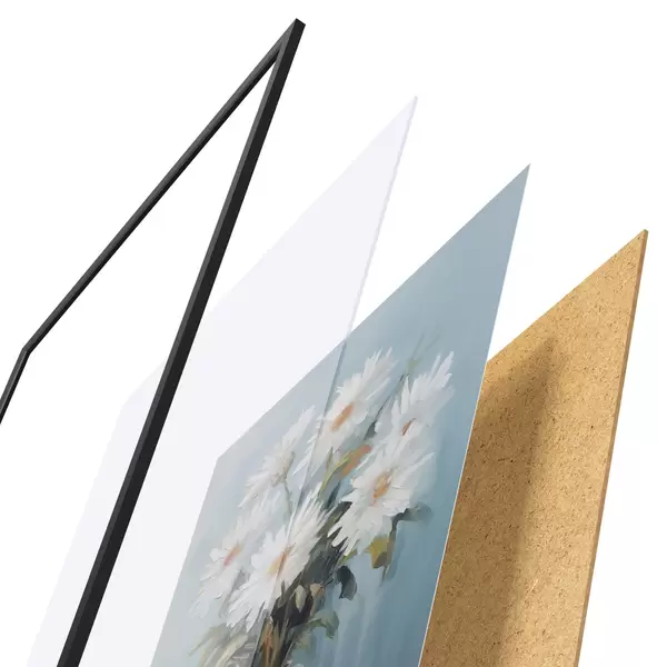De poster bestaat uit een frame, plexiglas, geprinte afbeelding en spaanplaat achterkant. De poster kan meteen aan de muur worden gehangen dankzij de bevestigingen op de achterkant.