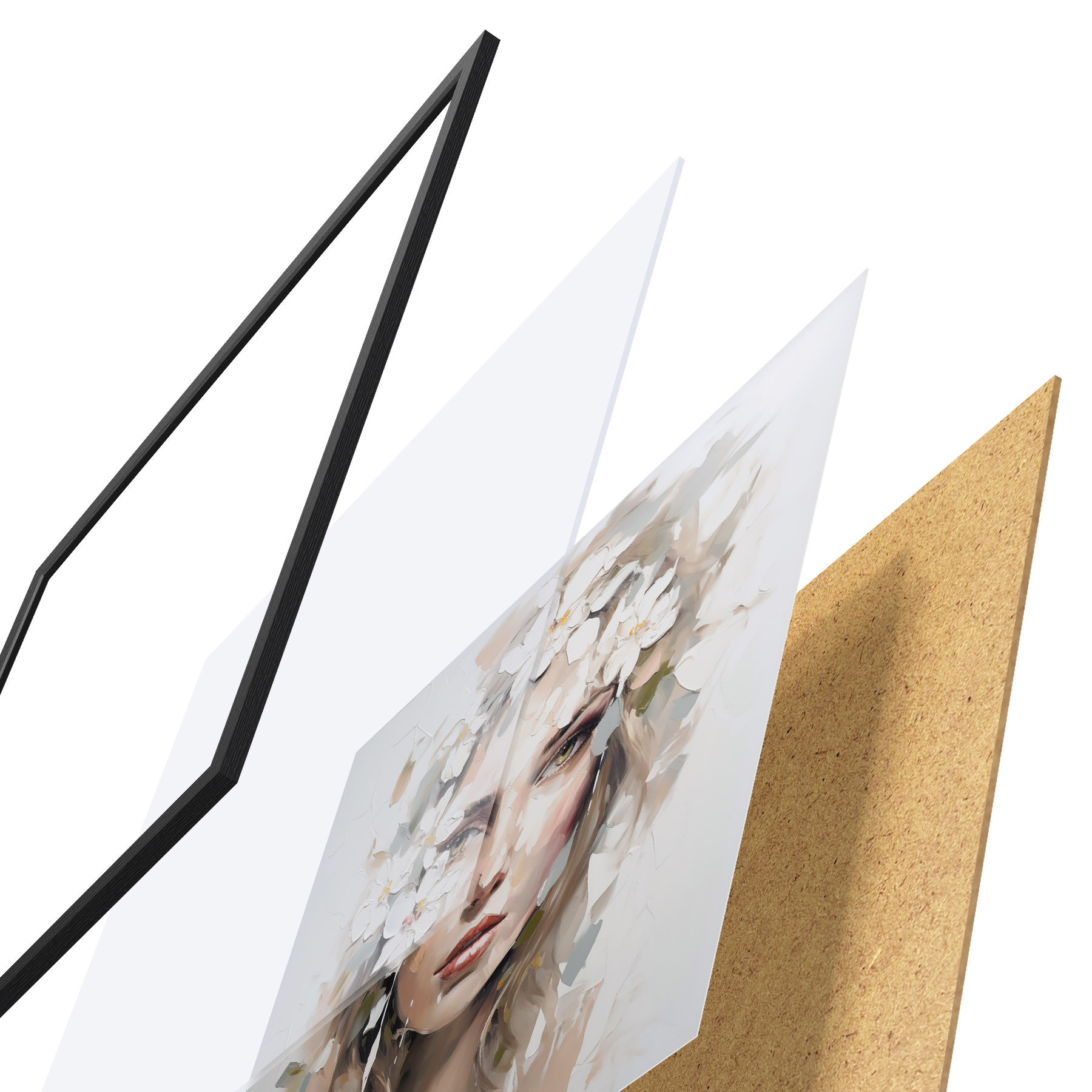 De poster bestaat uit een frame, plexiglas, geprinte afbeelding en spaanplaat achterkant. De poster kan meteen aan de muur worden gehangen dankzij de bevestigingen op de achterkant.