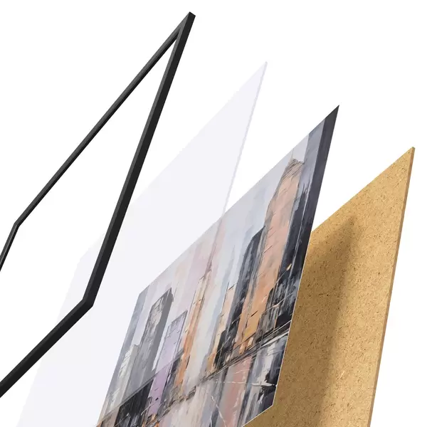 De poster bestaat uit een frame, plexiglas, geprinte afbeelding en spaanplaat achterkant. De poster kan meteen aan de muur worden gehangen dankzij de bevestigingen op de achterkant.