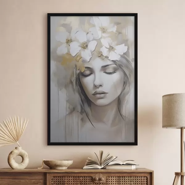 Poster Abstract portret van een meisje met bloemen, imitatie van een schilderij N° f46756
