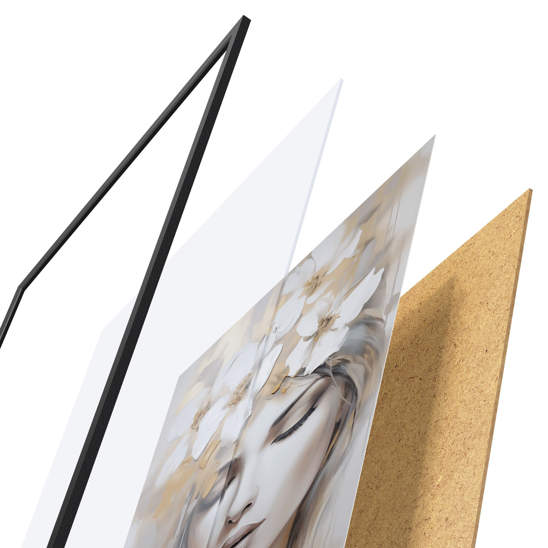 De poster bestaat uit een frame, plexiglas, geprinte afbeelding en spaanplaat achterkant. De poster kan meteen aan de muur worden gehangen dankzij de bevestigingen op de achterkant.