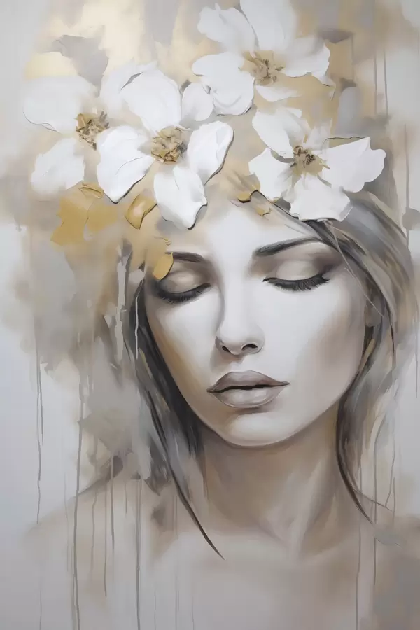 Poster Abstract portret van een meisje met bloemen, imitatie van een schilderij N° f46756