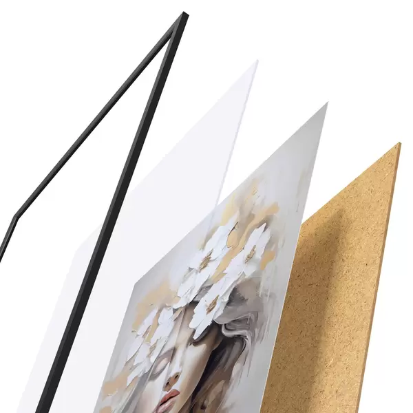 De poster bestaat uit een frame, plexiglas, geprinte afbeelding en spaanplaat achterkant. De poster kan meteen aan de muur worden gehangen dankzij de bevestigingen op de achterkant.