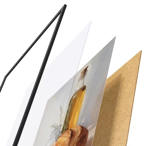 De poster bestaat uit een frame, plexiglas, geprinte afbeelding en spaanplaat achterkant. De poster kan meteen aan de muur worden gehangen dankzij de bevestigingen op de achterkant.