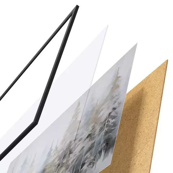 De poster bestaat uit een frame, plexiglas, geprinte afbeelding en spaanplaat achterkant. De poster kan meteen aan de muur worden gehangen dankzij de bevestigingen op de achterkant.