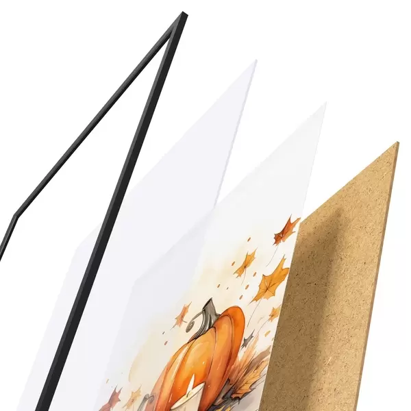 De poster bestaat uit een frame, plexiglas, geprinte afbeelding en spaanplaat achterkant. De poster kan meteen aan de muur worden gehangen dankzij de bevestigingen op de achterkant.