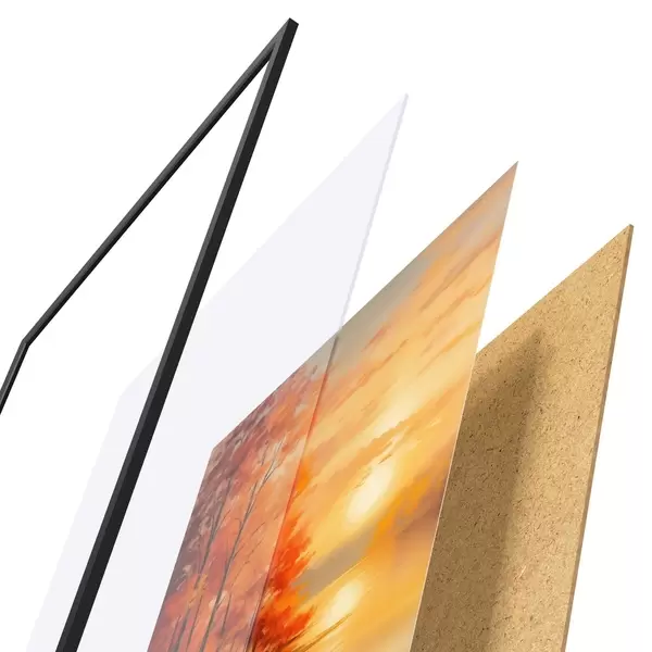 De poster bestaat uit een frame, plexiglas, geprinte afbeelding en spaanplaat achterkant. De poster kan meteen aan de muur worden gehangen dankzij de bevestigingen op de achterkant.