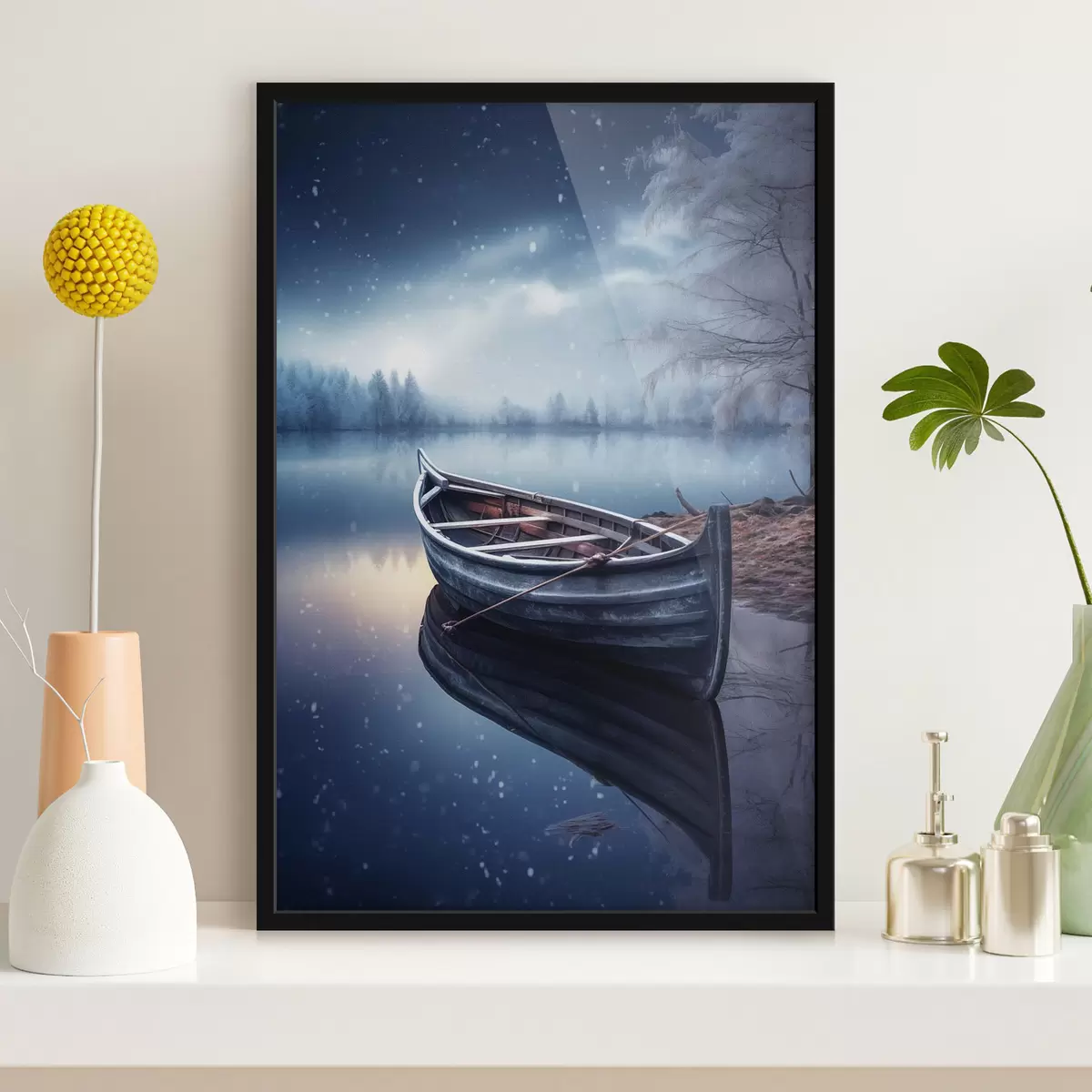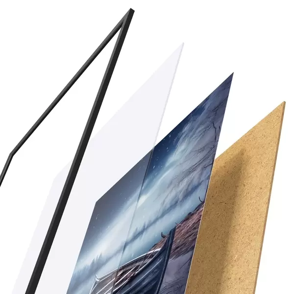 De poster bestaat uit een frame, plexiglas, geprinte afbeelding en spaanplaat achterkant. De poster kan meteen aan de muur worden gehangen dankzij de bevestigingen op de achterkant.
