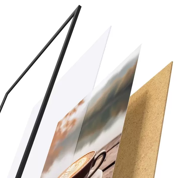 De poster bestaat uit een frame, plexiglas, geprinte afbeelding en spaanplaat achterkant. De poster kan meteen aan de muur worden gehangen dankzij de bevestigingen op de achterkant.