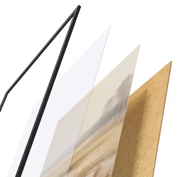 De poster bestaat uit een frame, plexiglas, geprinte afbeelding en spaanplaat achterkant. De poster kan meteen aan de muur worden gehangen dankzij de bevestigingen op de achterkant.