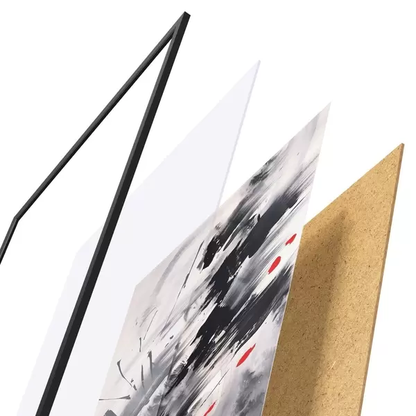 De poster bestaat uit een frame, plexiglas, geprinte afbeelding en spaanplaat achterkant. De poster kan meteen aan de muur worden gehangen dankzij de bevestigingen op de achterkant.