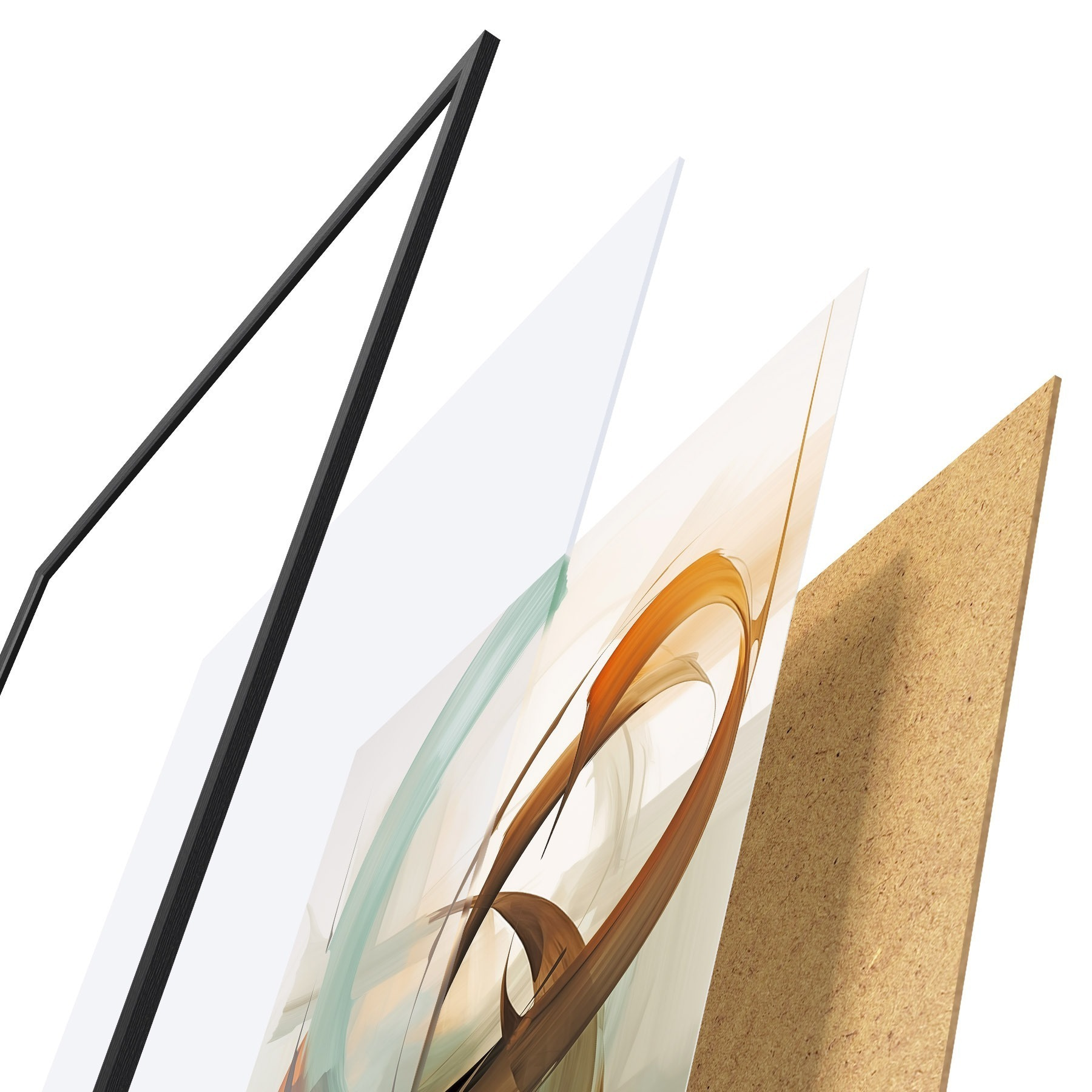 De poster bestaat uit een frame, plexiglas, geprinte afbeelding en spaanplaat achterkant. De poster kan meteen aan de muur worden gehangen dankzij de bevestigingen op de achterkant.