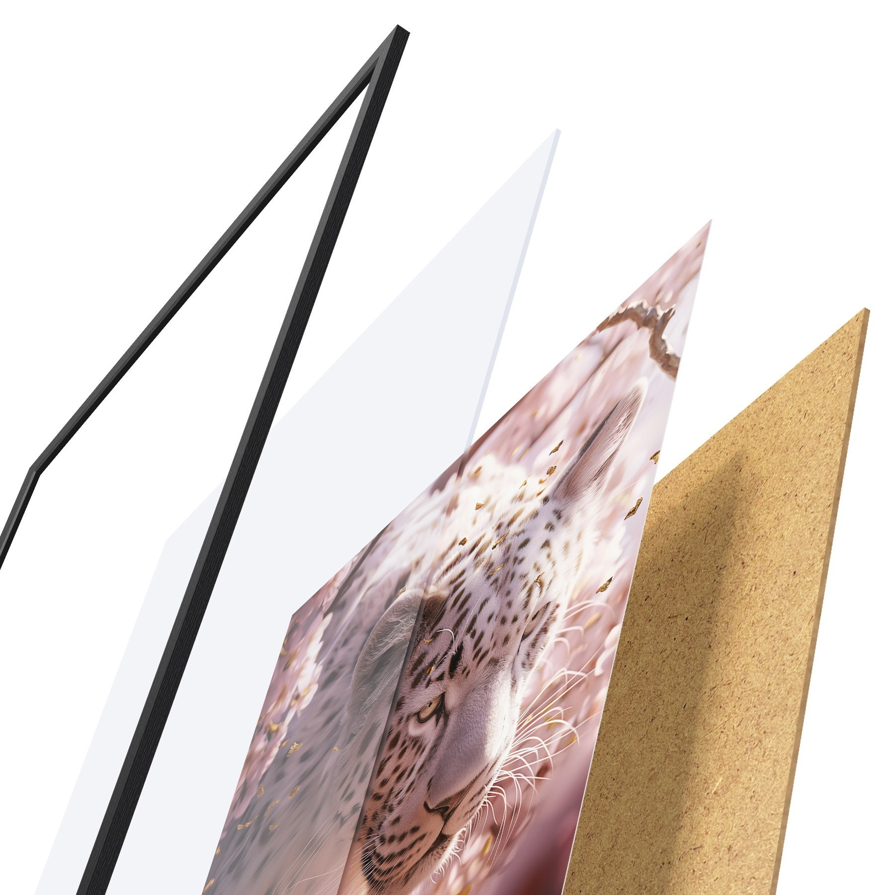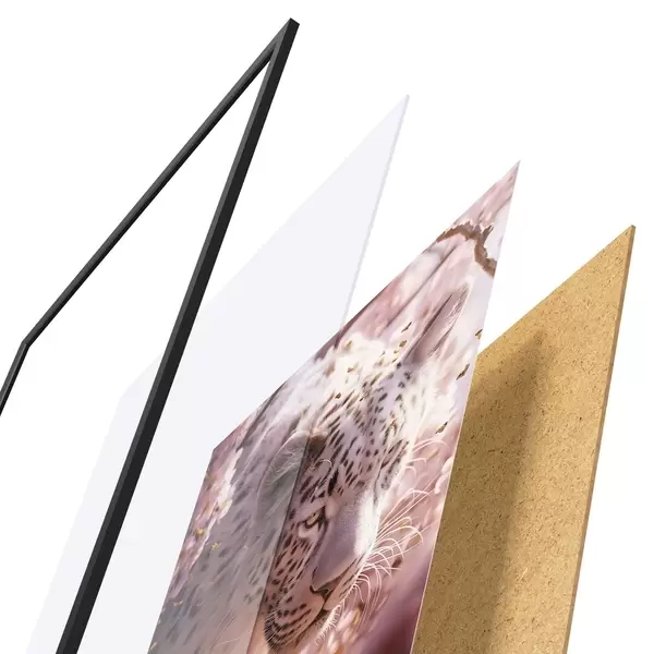 De poster bestaat uit een frame, plexiglas, geprinte afbeelding en spaanplaat achterkant. De poster kan meteen aan de muur worden gehangen dankzij de bevestigingen op de achterkant.