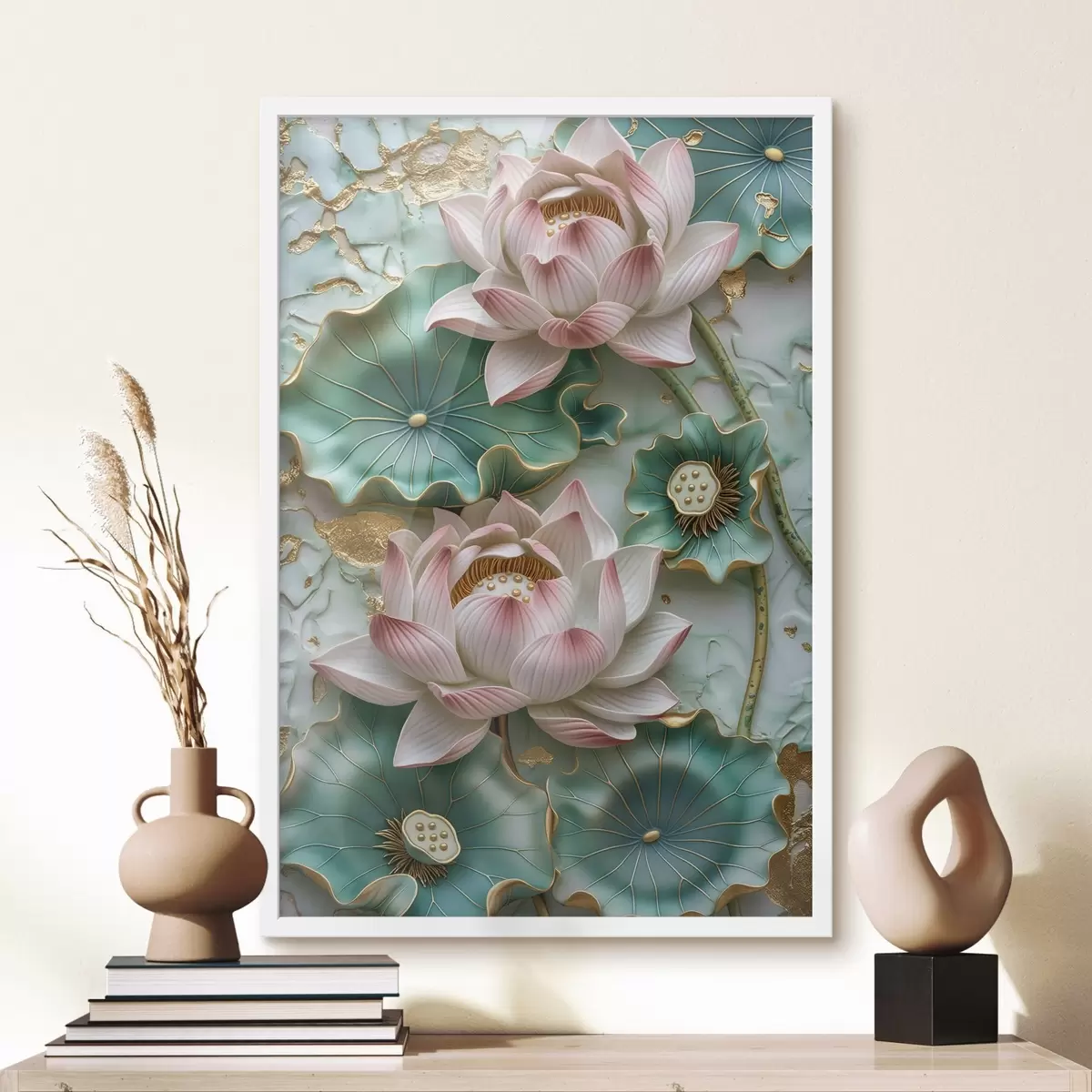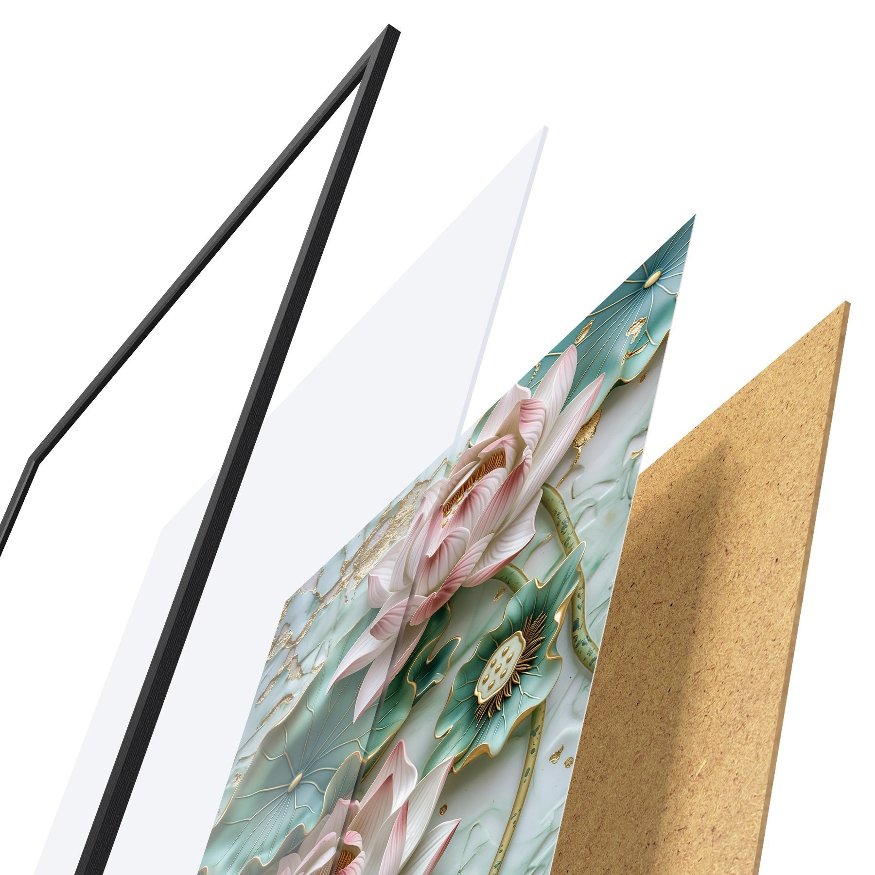 De poster bestaat uit een frame, plexiglas, geprinte afbeelding en spaanplaat achterkant. De poster kan meteen aan de muur worden gehangen dankzij de bevestigingen op de achterkant.