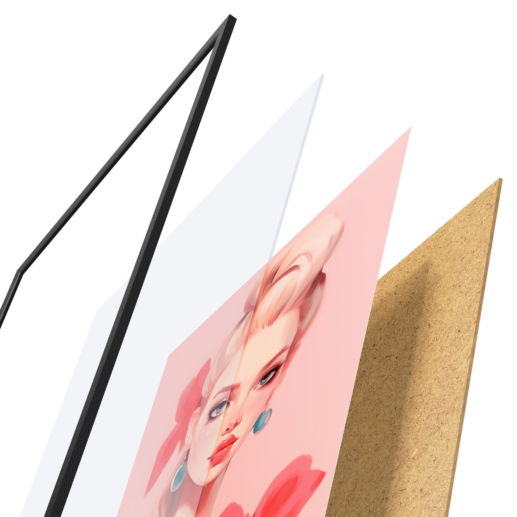 De poster bestaat uit een frame, plexiglas, geprinte afbeelding en spaanplaat achterkant. De poster kan meteen aan de muur worden gehangen dankzij de bevestigingen op de achterkant.