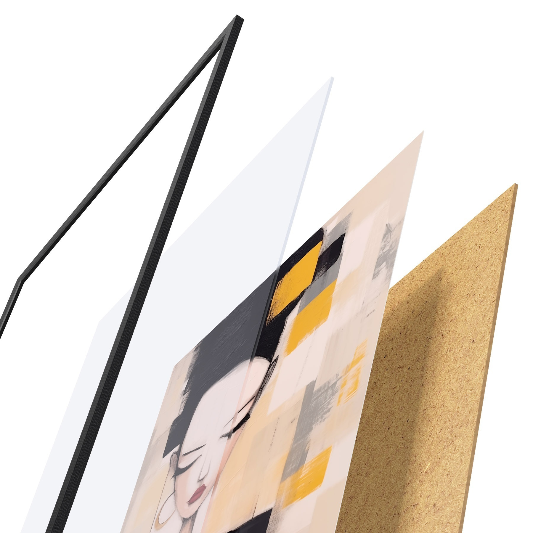 De poster bestaat uit een frame, plexiglas, geprinte afbeelding en spaanplaat achterkant. De poster kan meteen aan de muur worden gehangen dankzij de bevestigingen op de achterkant.