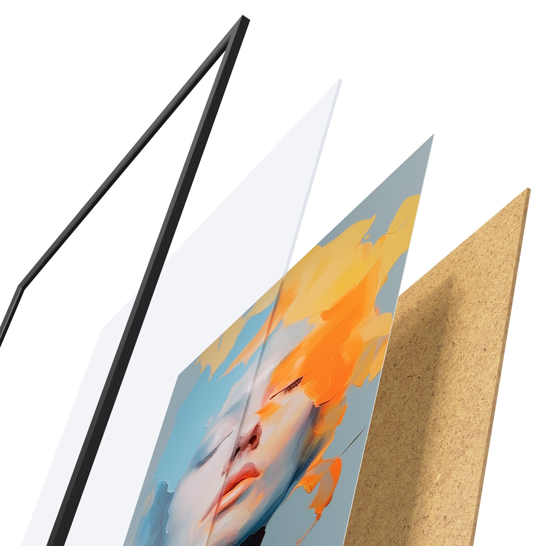 De poster bestaat uit een frame, plexiglas, geprinte afbeelding en spaanplaat achterkant. De poster kan meteen aan de muur worden gehangen dankzij de bevestigingen op de achterkant.