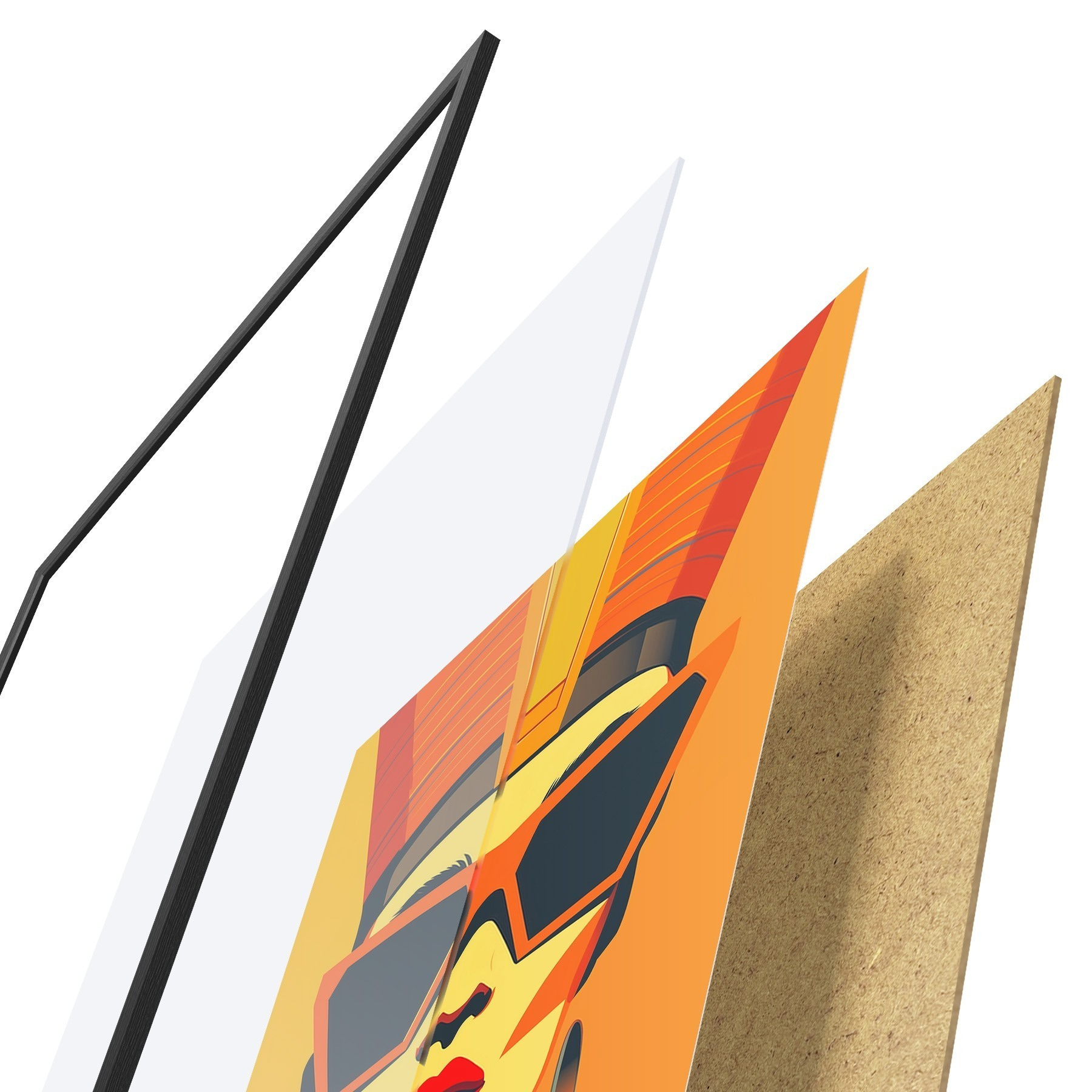 De poster bestaat uit een frame, plexiglas, geprinte afbeelding en spaanplaat achterkant. De poster kan meteen aan de muur worden gehangen dankzij de bevestigingen op de achterkant.