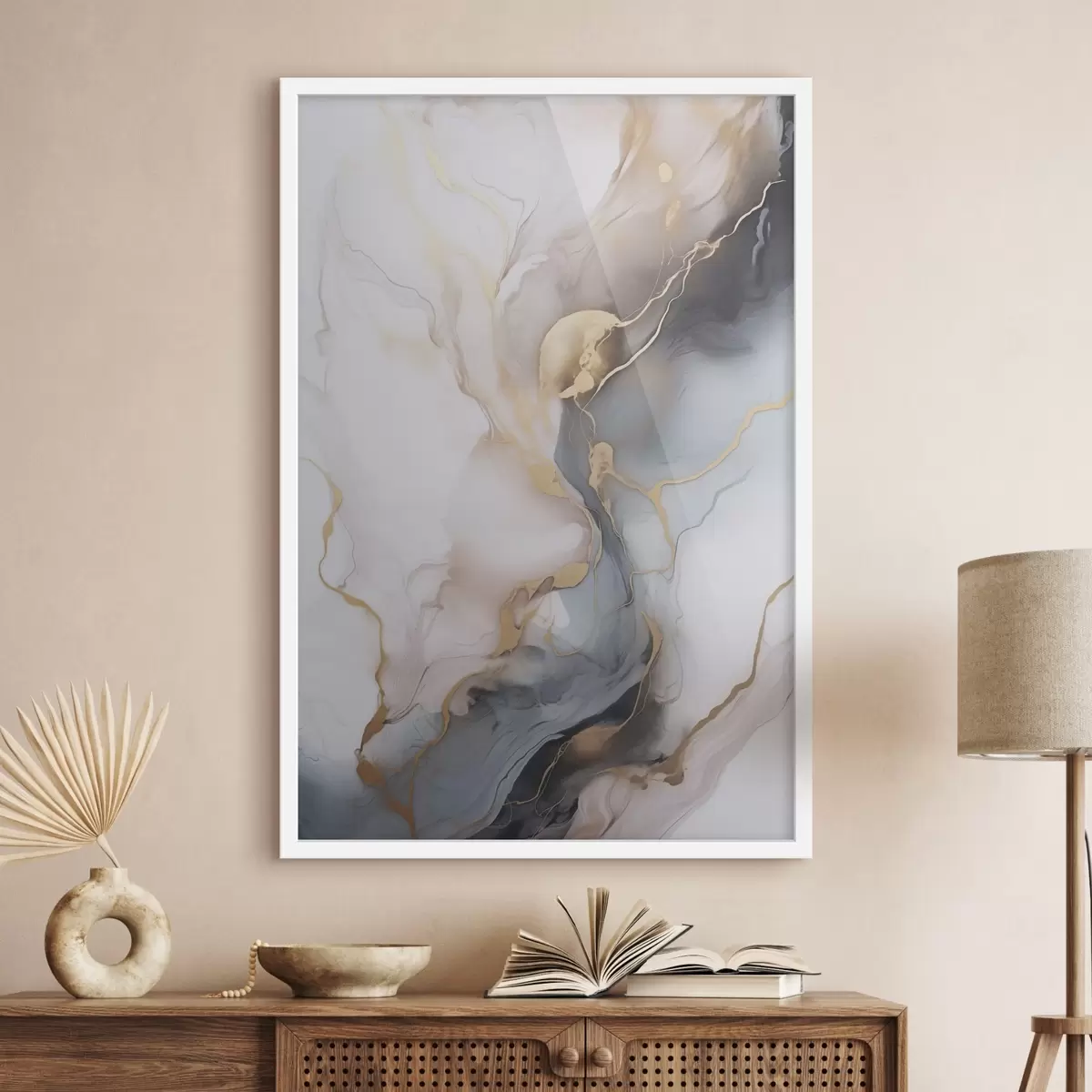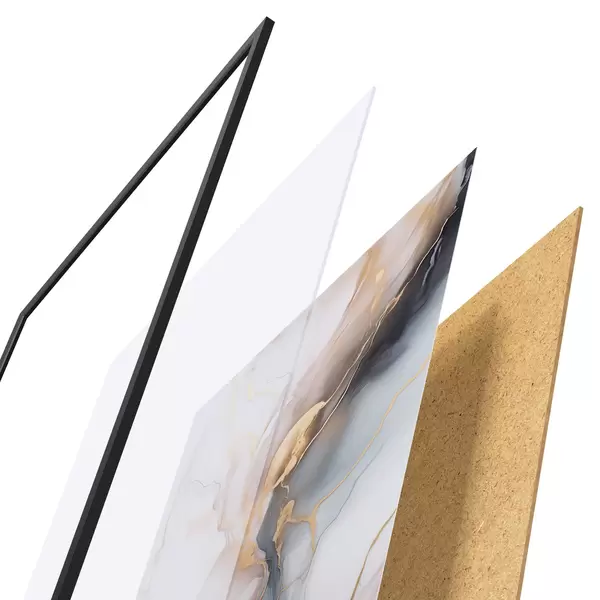 De poster bestaat uit een frame, plexiglas, geprinte afbeelding en spaanplaat achterkant. De poster kan meteen aan de muur worden gehangen dankzij de bevestigingen op de achterkant.