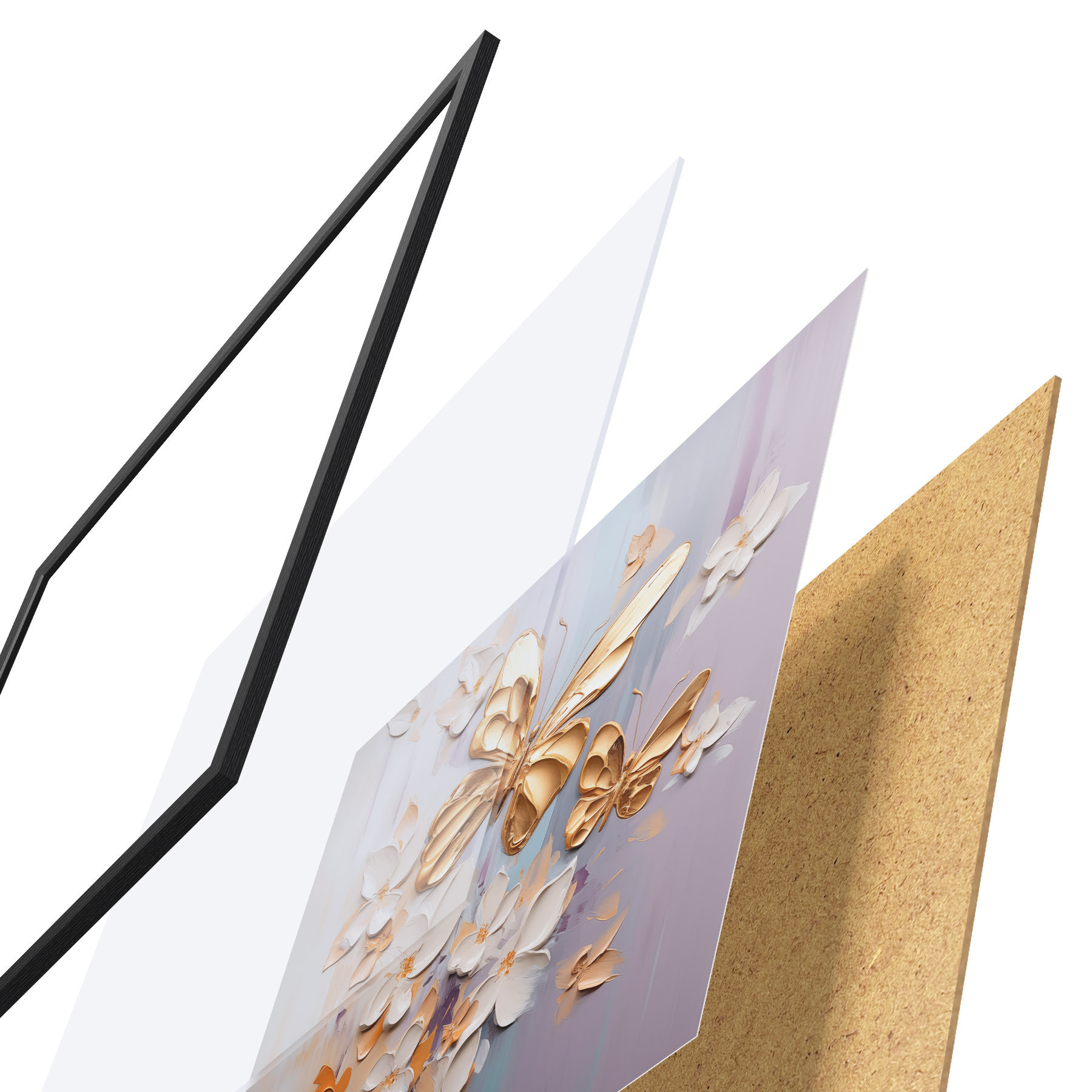 De poster bestaat uit een frame, plexiglas, geprinte afbeelding en spaanplaat achterkant. De poster kan meteen aan de muur worden gehangen dankzij de bevestigingen op de achterkant.