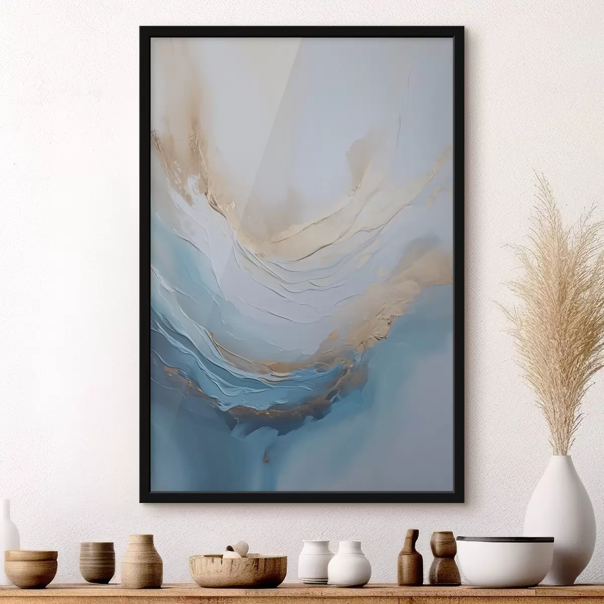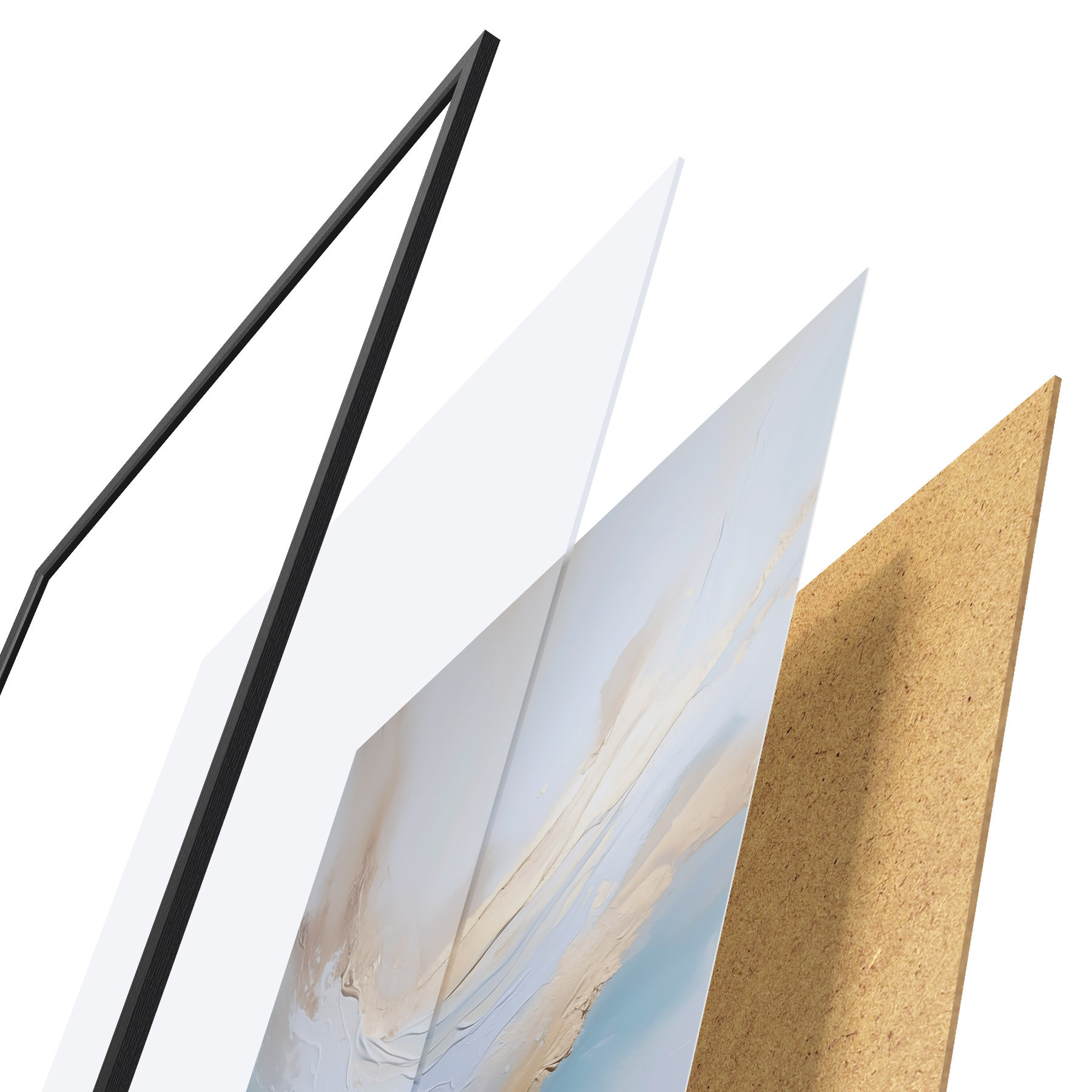 De poster bestaat uit een frame, plexiglas, geprinte afbeelding en spaanplaat achterkant. De poster kan meteen aan de muur worden gehangen dankzij de bevestigingen op de achterkant.