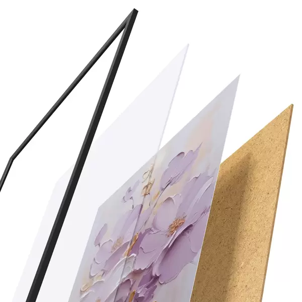 De poster bestaat uit een frame, plexiglas, geprinte afbeelding en spaanplaat achterkant. De poster kan meteen aan de muur worden gehangen dankzij de bevestigingen op de achterkant.