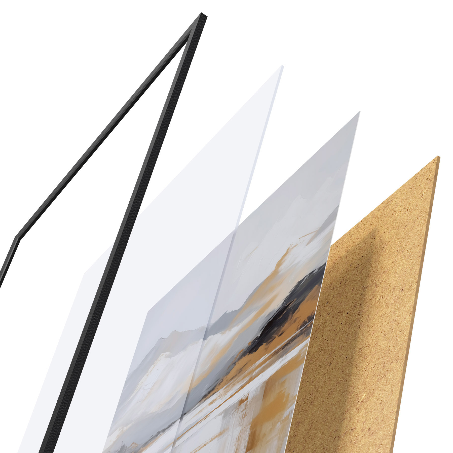De poster bestaat uit een frame, plexiglas, geprinte afbeelding en spaanplaat achterkant. De poster kan meteen aan de muur worden gehangen dankzij de bevestigingen op de achterkant.