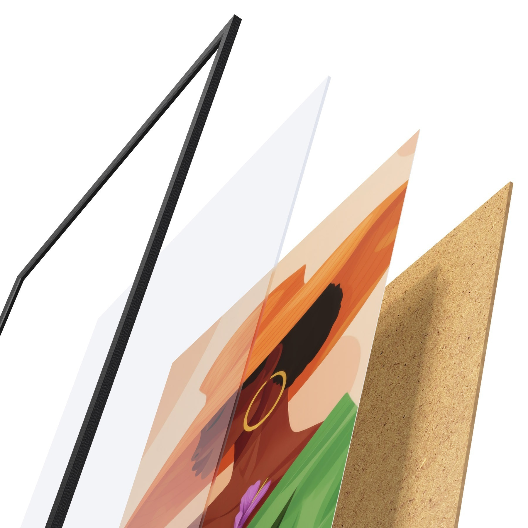 De poster bestaat uit een frame, plexiglas, geprinte afbeelding en spaanplaat achterkant. De poster kan meteen aan de muur worden gehangen dankzij de bevestigingen op de achterkant.