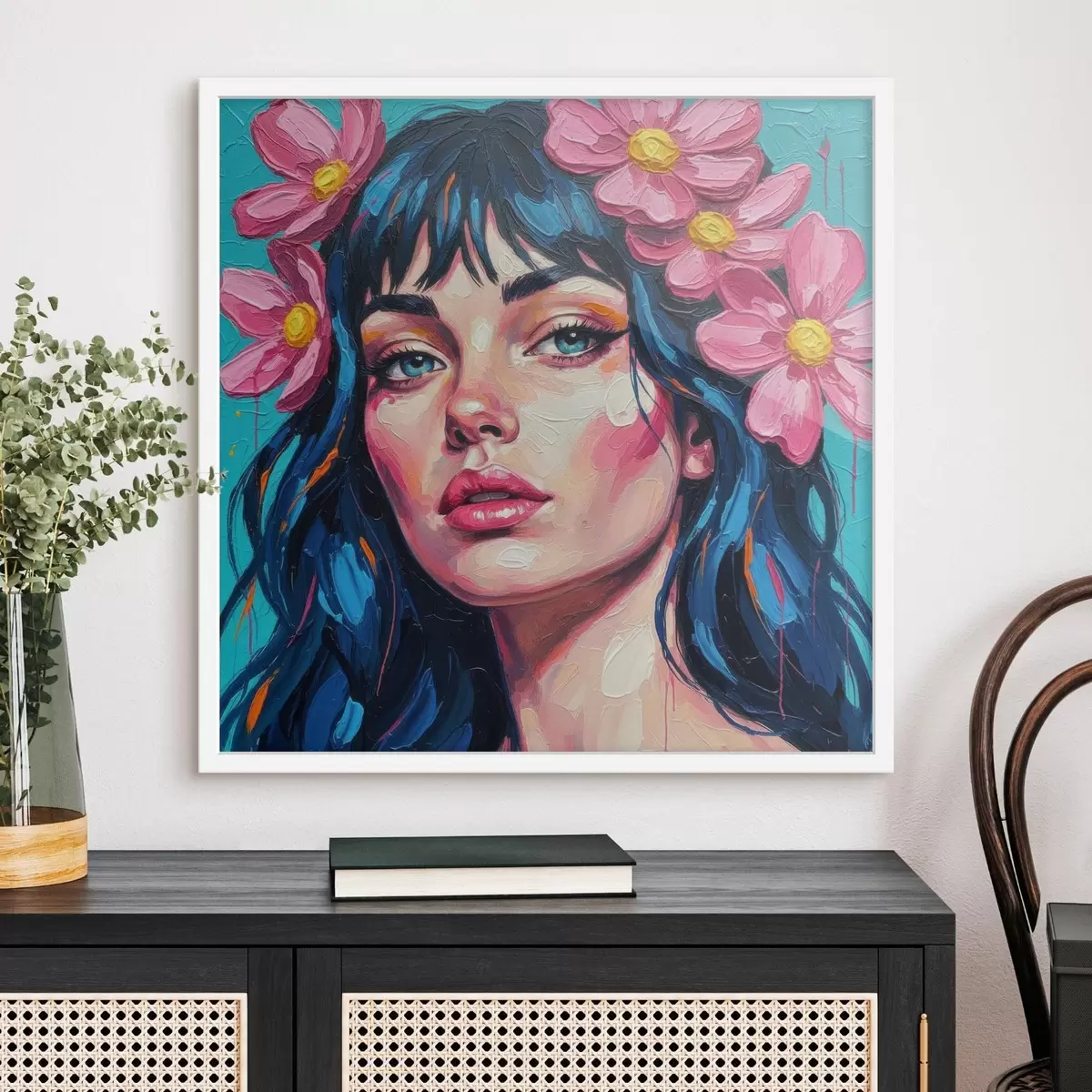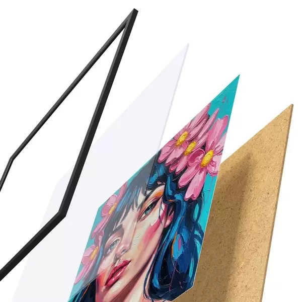 De poster bestaat uit een frame, plexiglas, geprinte afbeelding en spaanplaat achterkant. De poster kan meteen aan de muur worden gehangen dankzij de bevestigingen op de achterkant.