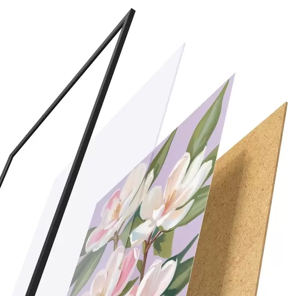 De poster bestaat uit een frame, plexiglas, geprinte afbeelding en spaanplaat achterkant. De poster kan meteen aan de muur worden gehangen dankzij de bevestigingen op de achterkant.