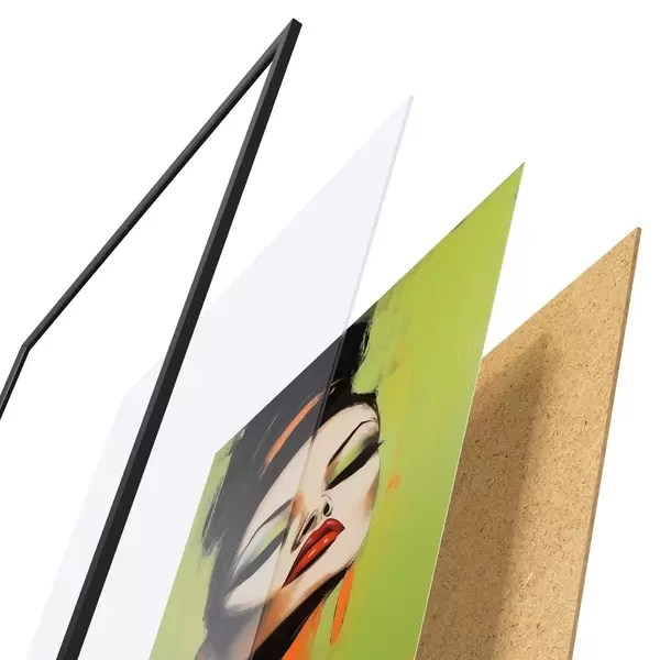 De poster bestaat uit een frame, plexiglas, geprinte afbeelding en spaanplaat achterkant. De poster kan meteen aan de muur worden gehangen dankzij de bevestigingen op de achterkant.