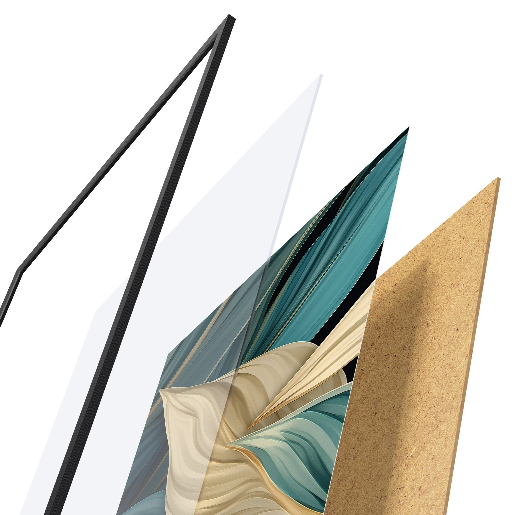 De poster bestaat uit een frame, plexiglas, geprinte afbeelding en spaanplaat achterkant. De poster kan meteen aan de muur worden gehangen dankzij de bevestigingen op de achterkant.